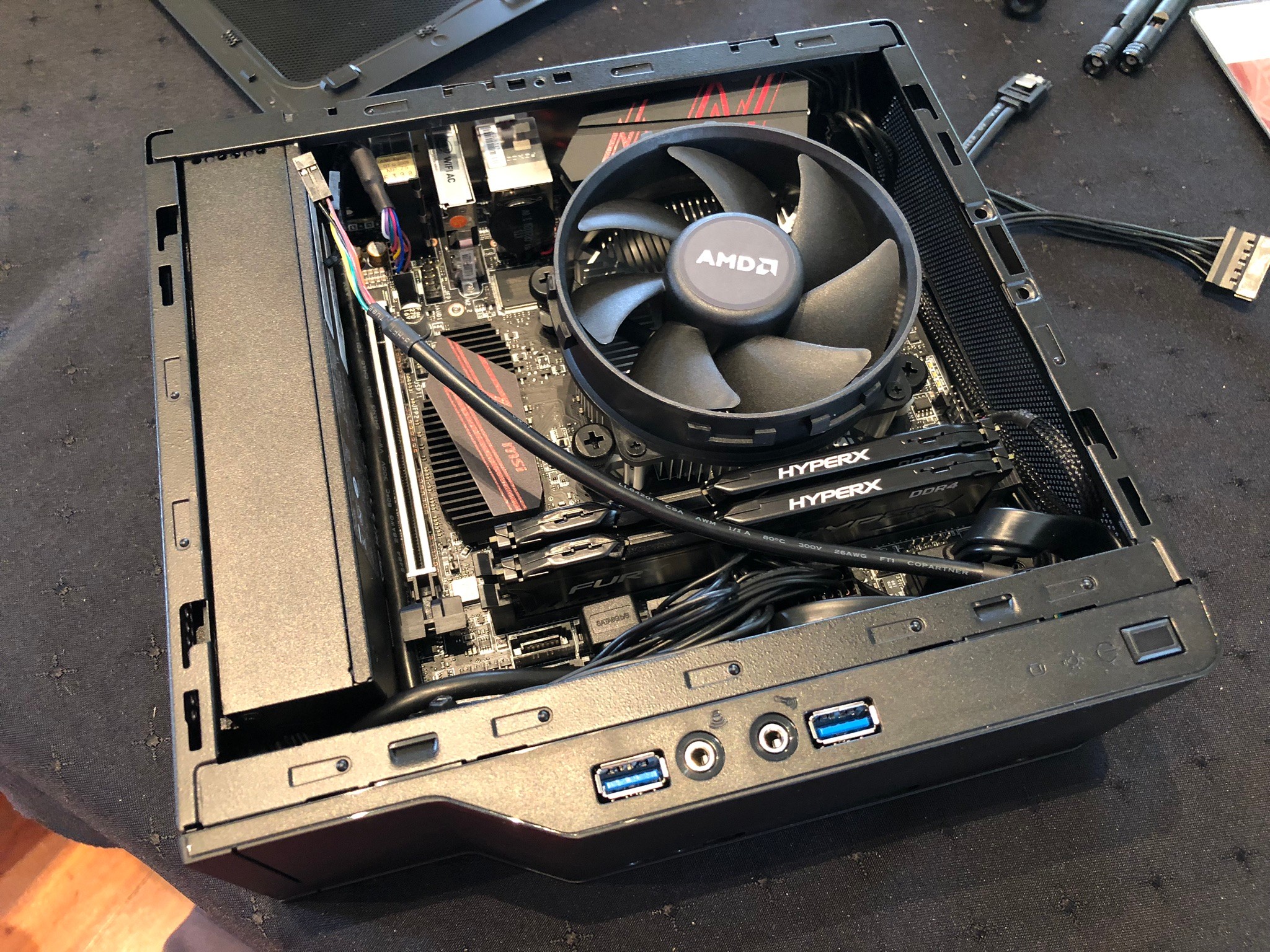 The AMD cooler had a cosmetic ring which needed to be removed to clear the lid. Wiring was a bit tight, but pushed into the small front gap reasonably easily.