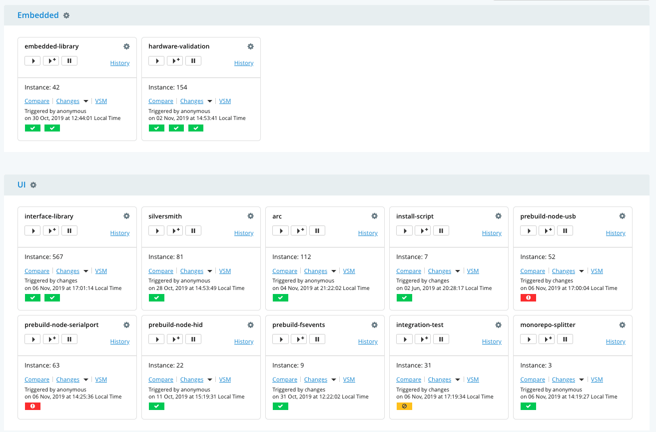 [go] Job Started: 2019-03-13 01:06:32 UTC[go] Start to prepare embedded-library/14/Testing/1/Ceedling on nix [/var/lib/go-agent][go] Cleaning working directory "/var/lib/go-agent/pipelines/embedded-library" since stage is configured to clean working directory[go] Start to update materials.[go] Start to build embedded-library/14/Testing/1/Ceedling on nix [/var/lib/go-agent][go] Task: ./setup_tests.sh ytook: 1.454s[go] Task: ceedling test:alltook: 4.414s[go] Task: ceedling gcov:alltook: 4.214s[go] Current job status: passed[go] Start to create properties embedded-library/14/Testing/1/Ceedling on nix [/var/lib/go-agent][go] Start to upload embedded-library/14/Testing/1/Ceedling on nix [/var/lib/go-agent][go] Job completed embedded-library/14/Testing/1/Ceedling on nix [/var/lib/go-agent]Our pipelines look something like this