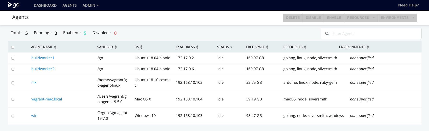 Because the GoCD server and the build agents all share a common virtualised network, the agents are seen by the server and adopted into the agent pool. From here we assign specific resources to each agent, allowing jobs to pick a given agent based on the software stack, OS, and connected test hardware.