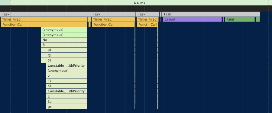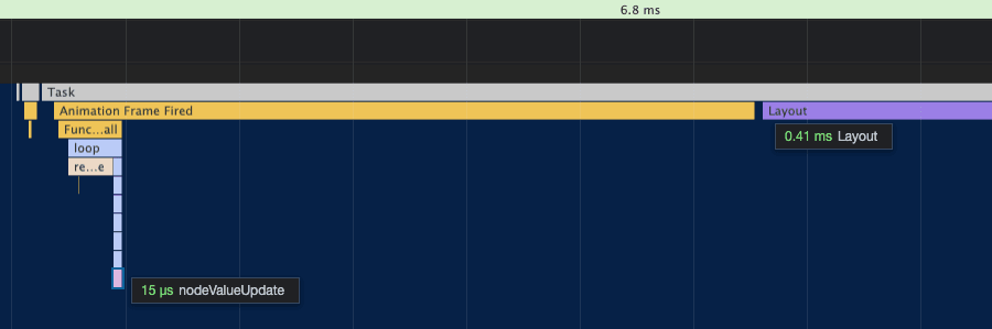 This step didn't reduce the layout time as significantly as I would have thought, but the aggregate time from our sample has reduced again. We're beating React Production mode by even more!