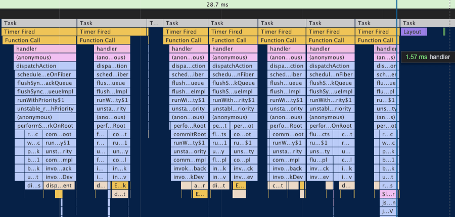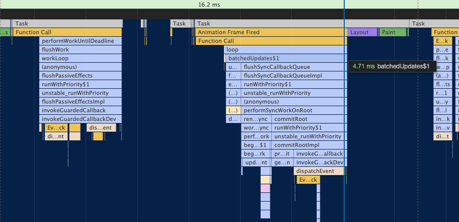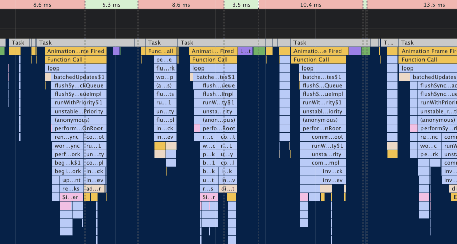 function SlowReactPrinter(props: SlowReactPrinterProps) { const [state, setState] = useState(false) useUpdate((newState: boolean) => { setState(newState) }) return <span>{state ? 1 : 0}</span>}The useUpdate hook can be replaced with any externally triggered update mechanism. It can be a timer or a subscription to a Redux store, the implementation details don't matter. For these flame graphs updates are pushed at the refresh rate of the monitor.