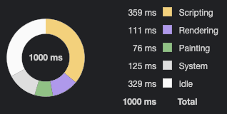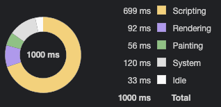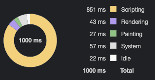 A quick note on the React Profiler extension - I don't think it's useful for this kind of performance optimisation. While none of its information is incorrect, it's not helpful in improving the situation. It identifies that the thing that's updating is the span in the component, but doesn't help to identify the next steps. It's technically correct that the actual text updates are very quick, but looking at this screenshot you would think that performance is 'just fine' when in reality, the app is pinning the JS thread at 85% just to render 7 text labels.