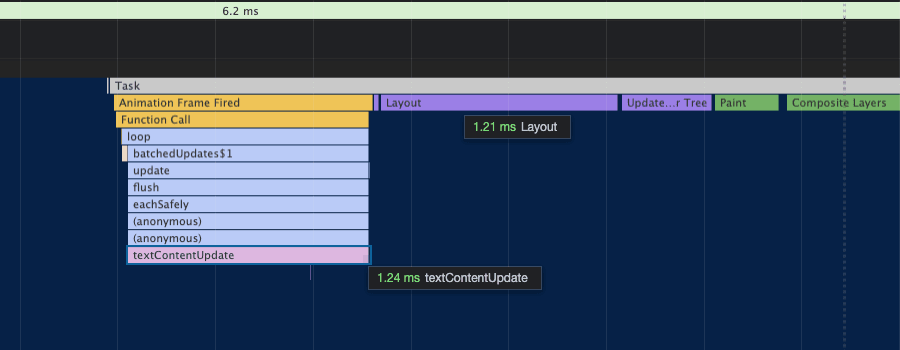 function FasterReactPrinter(props: SlowReactPrinterProps) { const ref = useRef<HTMLSpanElement>(null) const initialState = useUpdate((newState: boolean) => { // the name is purely for better visibility in the flame graph raf.write(function textContentUpdate() { if (ref.current) { ref.current.textContent = String(newState ? 1 : 0) } }) }) return <span ref={ref}>{initialState ? 1 : 0}</span>}The span provides a mutable reference that can be used for imperative updates when they come in. The initial state can be pulled from the useUpdate hook when React initially renders the component.