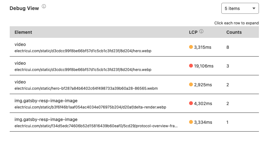 The debug view is excellent, showing exactly which element took the most time to render. On our features page, it tends to be either the poster or the video itself for the hero element, which is to be expected. It is unfortunate that some users take 19 seconds to load a 16kb image!