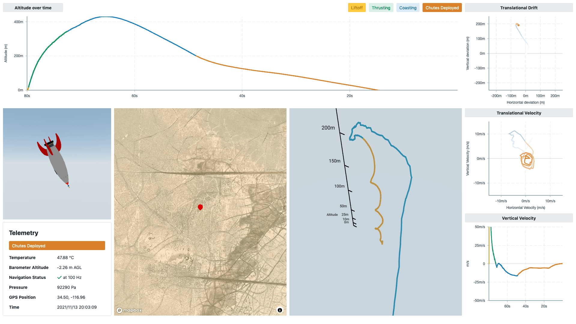 const pos = new DataSource<XYZEvent>()const col = new DataSource<ColorEvent>()const mixed = colorMixer(col, pos)const Page = () => { return ( <ChartContainer> <LineChart dataSource={mixed} accessor={data => data.q} // Errors! colorAccessor={data => data.color} // Autocompletes! /> </ChartContainer> )}Finally, here's the color mixer in action, combining the liftoff, thrusting, coasting and chutes deployed state with the XYZ position to color the flight path of a model rocket.