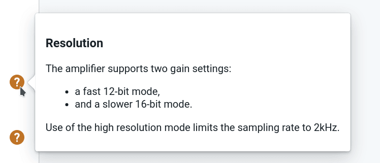 Often user-interfaces provide configuration controls which require prior experience or deep understanding of the product. In these situations, user-friendly help tool-tips can provide additional context, guides, or documentation links.