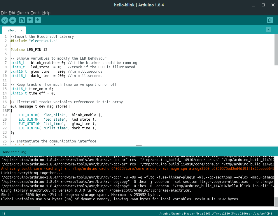 Electric UI integrates with your Arduino projects and features a deep set of examples to get moving fast. Lets install the library and flash the hello-blink demo sketch!