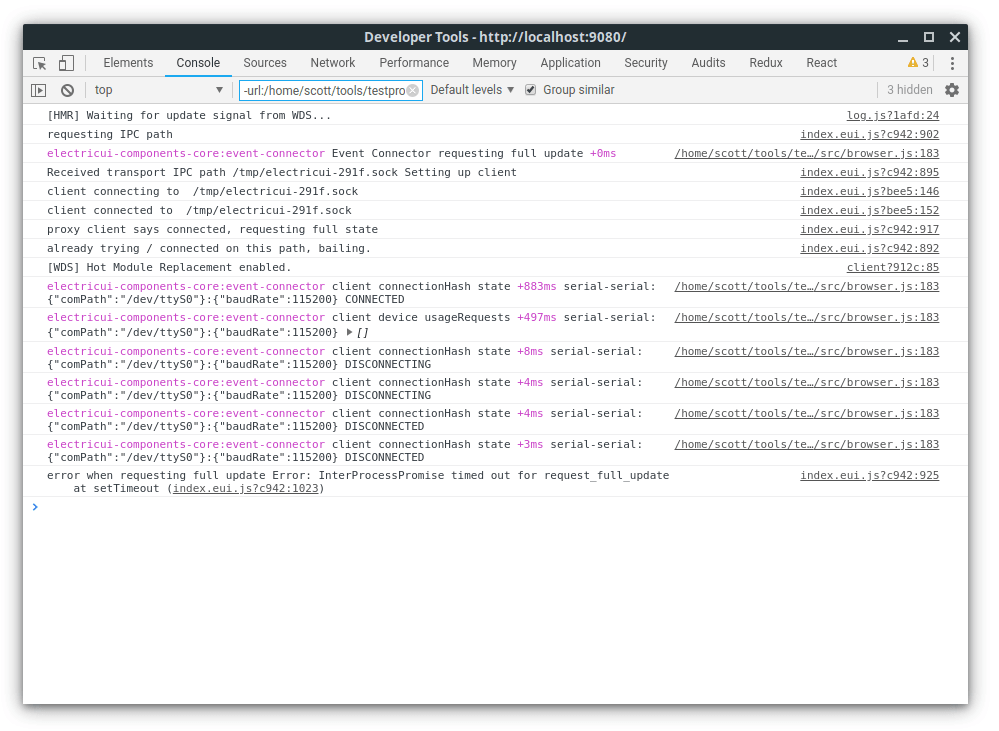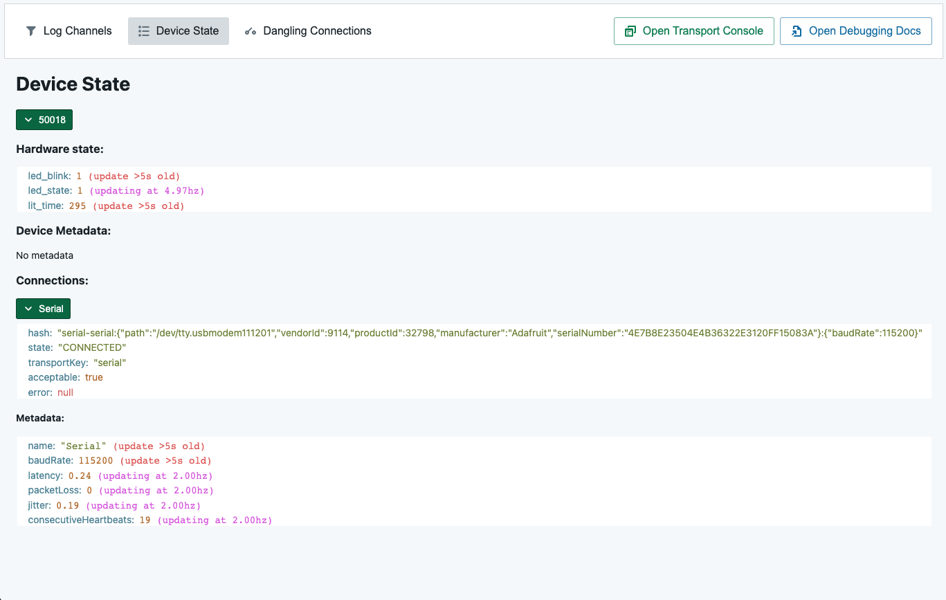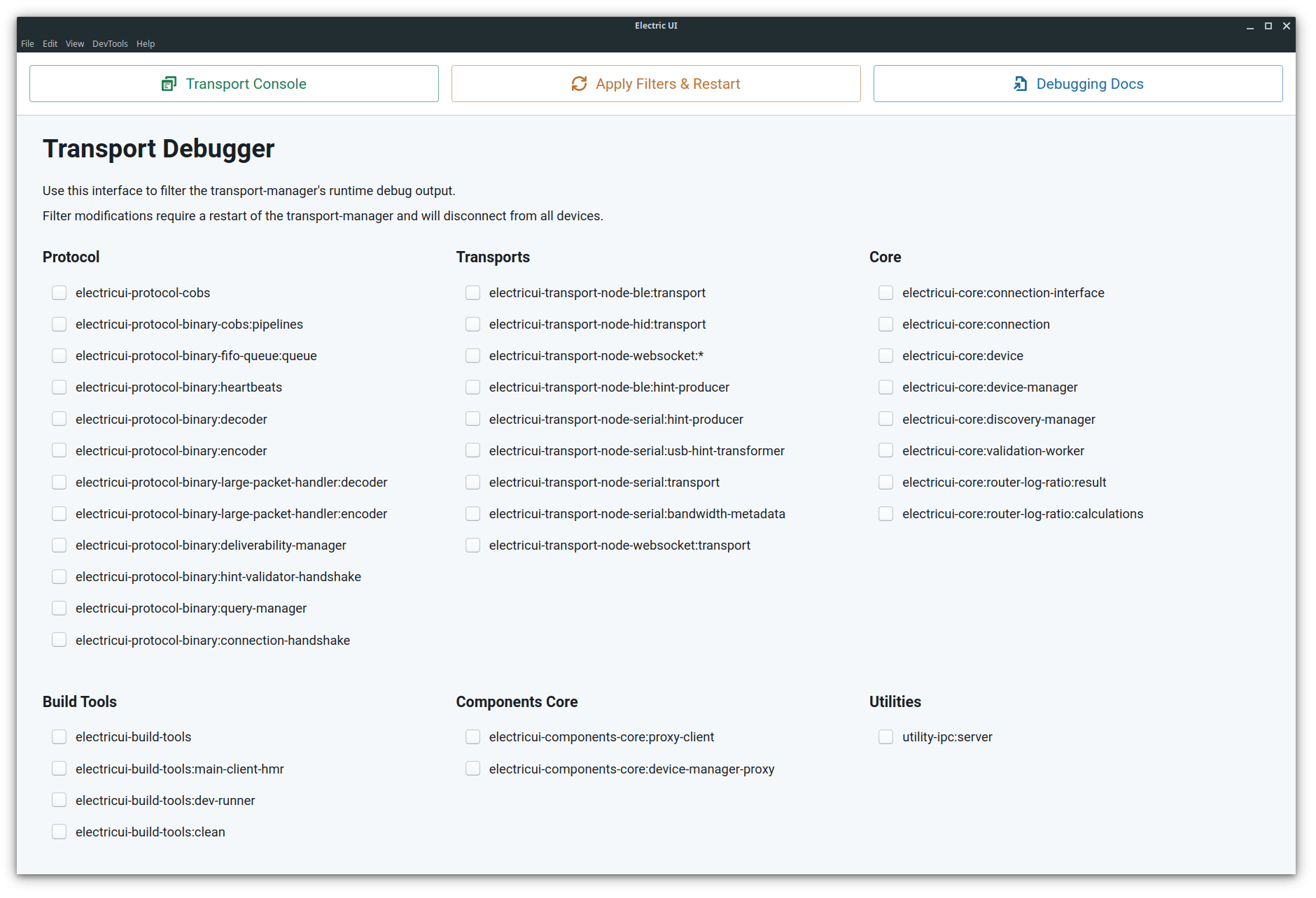 In development mode under the File menu, the "Show transport window" button which will open tooling for the transport-manager, responsible for everything to do with hardware interaction. The developer tooling is similar, but provides configurable levels of debug console output for transport and connections libraries.