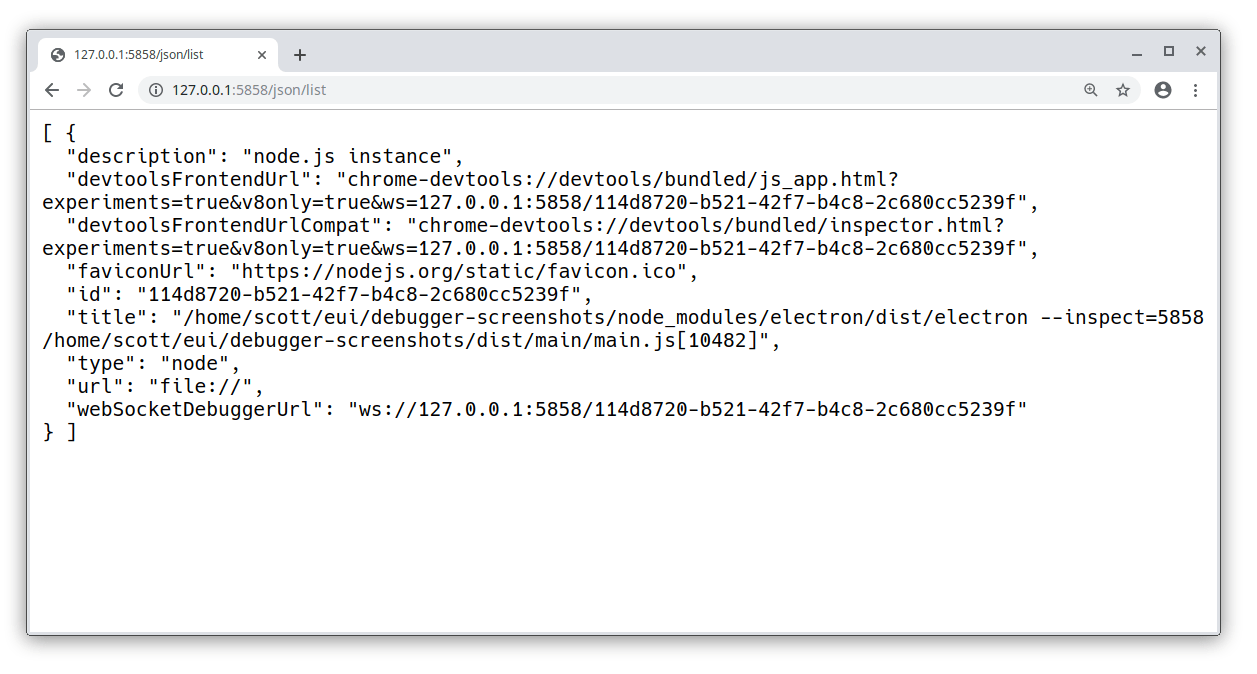 Open the remote debugger for Electric UI's root context by navigating to the devtoolsFrontendUrl listed on the json/list page.